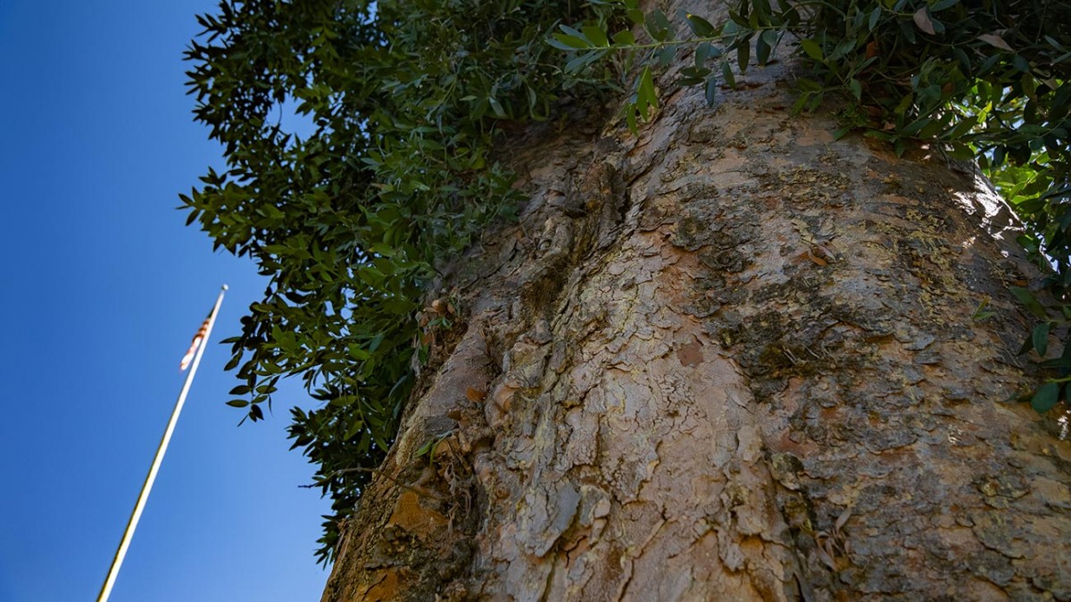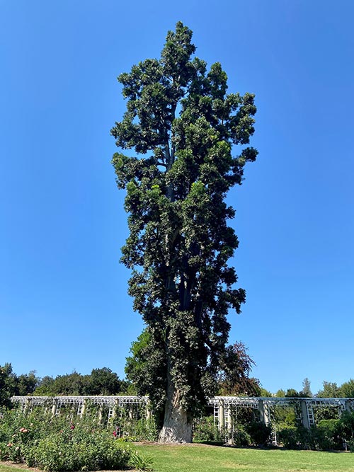 This 131-year-old Queensland kauri (Agathis robusta), towering above the Rose Garden, is the oldest planted tree at The Huntington. (Some of the site-native oaks are older.) On Sept. 24, 2021, the tree was measured at 112 feet tall with a 27.5-foot average crown spread and 235-inch trunk circumference, earning it a designation as a California Big Tree, The Huntington’s first such honor. Photo by Aric Allen.