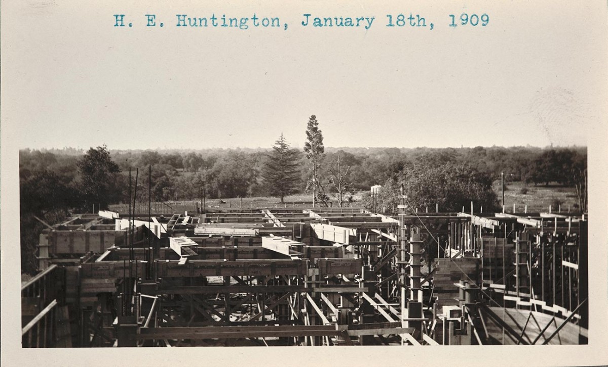 This 1909 photo shows the Queensland kauri, the tallest tree in the center of the photo, after its relocation during the construction of the Huntington residence, which would later become the Huntington Art Gallery. Huntington Library, Art Museum, and Botanical Gardens.