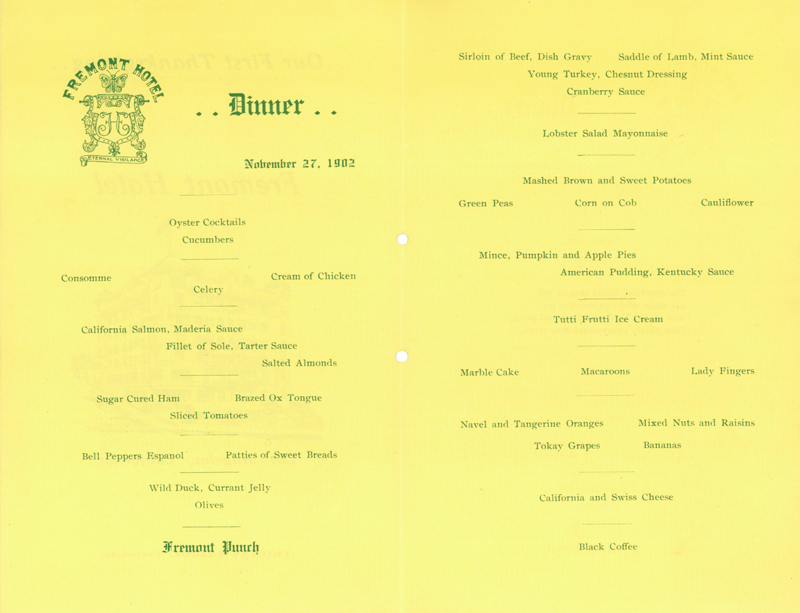 Thanksgiving menu from the Fremont Hotel, Los Angeles, California, 1902. Huntington Library, Art Collections, and Botanical Gardens.
