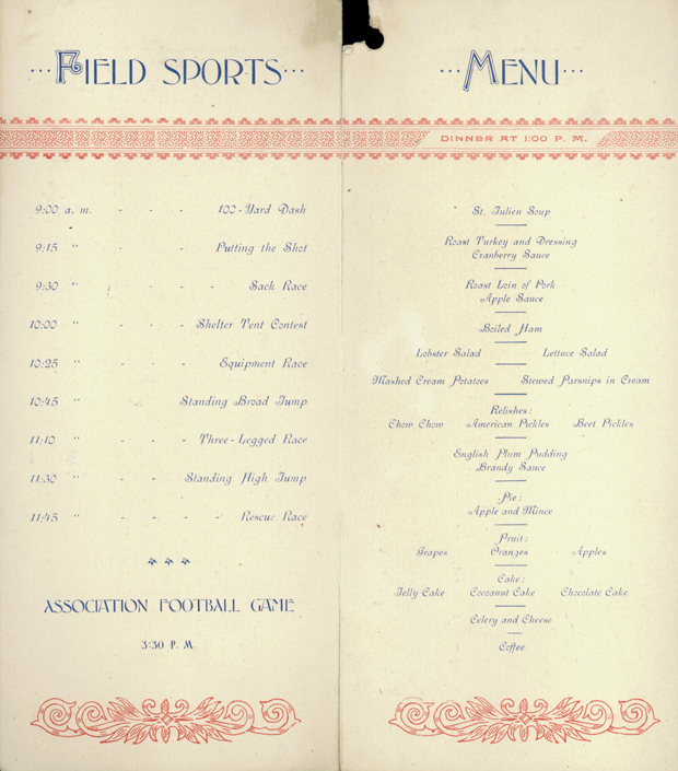 Your Thanksgiving culinary traditions and leisure activities may be slightly different from those of your ancestors. Would you cook green turtle or jowl with spinach for your relatives on Turkey Day? Perhaps you might consider adding a “Shelter Tent Contest” to your family backyard football game in remembrance of the Utah Volunteers. Traditions change over time and vary from family to family, but the social aspects presented in these menus from the past remind us that the importance of Thanksgiving lies not in the traditions or foods themselves, but in their ability to bring us together.