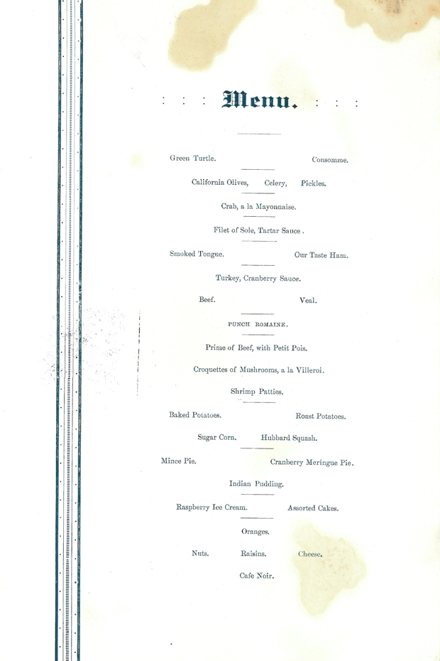 Thanksgiving menu from the Golden Eagle Hotel, Sacramento, California, 1892. Huntington Library, Art Collections, and Botanical Gardens.