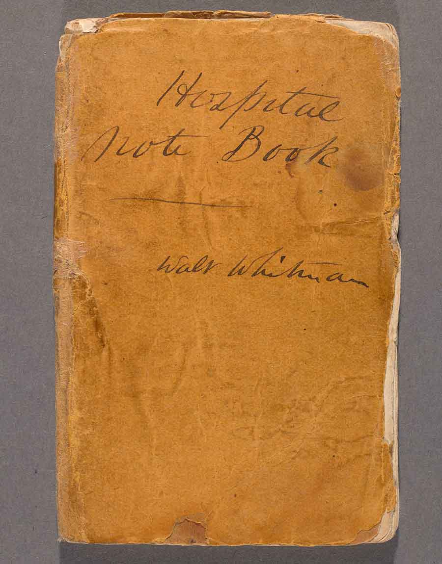 Among the gems in The Huntington’s collection is a little yellow-brown notebook, measuring 2 1/2 by 4 inches, made to carry in a vest pocket. It has 28 thin leaves, bound by a pink string. On its cover, an autograph ink inscription reads “Hospital Note Book” above a small horizontal line, and below the line, “Walt Whitman.”
