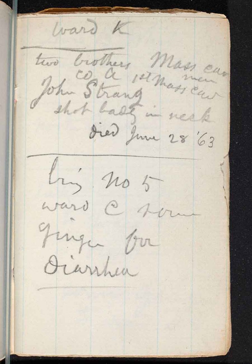 Page 13 of Whitman’s hospital notebook: “ward K / two brothers Mass cav men / co A 1st Mass cav / John Strang / shot badly in neck / died June 28 ’63 / bring no 5 / ward C some / ginger for / diarrhea.” The Huntington Library, Art Museum, and Botanical Gardens.