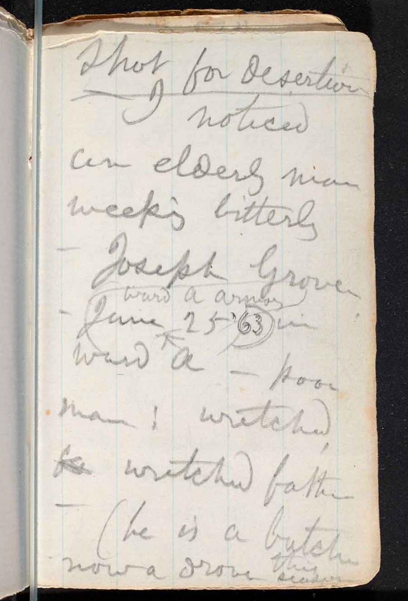 On page 27 of his hospital notebook, Whitman wrote of Joseph Grover, whose teenage son, William Grover, a Union soldier, had been executed for desertion: “I noticed / an elderly man / weeping bitterly / Joseph Grover / . . . June 25, ’63 / . . . – poor / man! wretched / wretched father.” The Huntington Library, Art Museum, and Botanical Gardens.