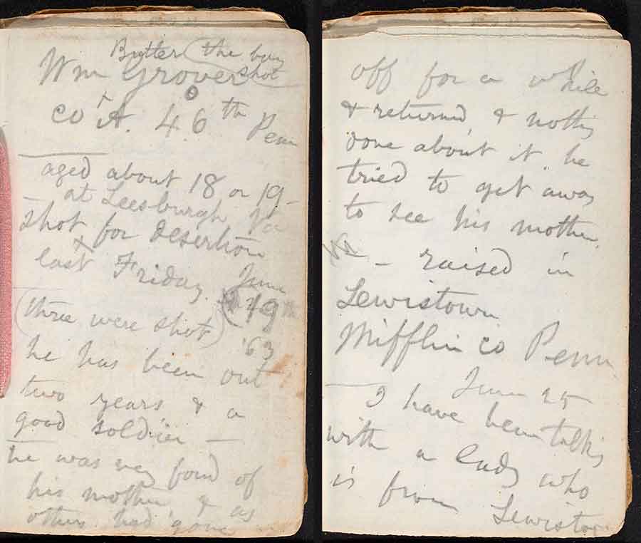 On page 29 and 30 of his hospital notebook, Whitman wrote of the teenage Union soldier William Grover, who had been executed for desertion. Grover had “been out / two years + a / good soldier – / he was very fond of / his mother + as / others had gone / off for a while / + returned + nothing / done about it. / he tried to get away / to see his mother – raised in / Lewistown / Mifflin co Penn.” The Huntington Library, Art Museum, and Botanical Gardens.