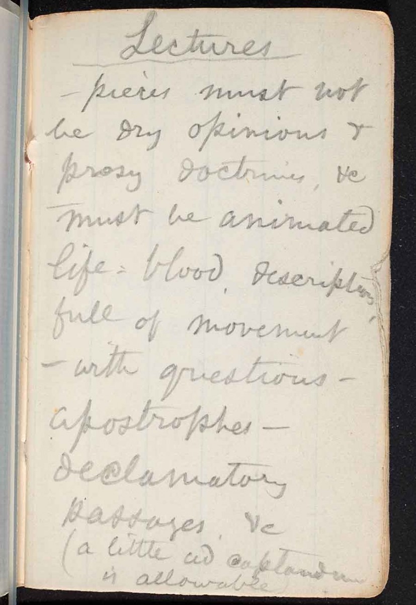 “Lectures / —pieces must not / be dry opinions + / prosy doctrines, &c / must be animated / life-blood descriptions, / full of movement / —with questions— / apostrophes— / declamatory / passages, &c. / (a little ad captandum / is allowable.” The Huntington Library, Art Museum, and Botanical Gardens.