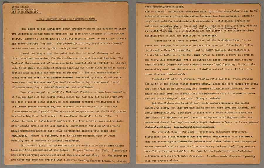 One of the most notable items, in this regard, is a 1933 article written by Loren Miller, a Los Angeles-based attorney focused on fighting discrimination, in which he protests the convictions of the Scottsboro Nine—nine Black youths, ranging in age from 13 to 19, who in 1931 were falsely accused of raping two white women on a freight train in Scottsboro, Alabama. The case received national coverage, resulted in two landmark U.S. Supreme Court decisions, and helped launch the civil rights movement. Miller, at the behest of the editor of the Daily Worker newspaper, used forceful prose to highlight the systemic racism faced by Black people in the courts. He wrote: