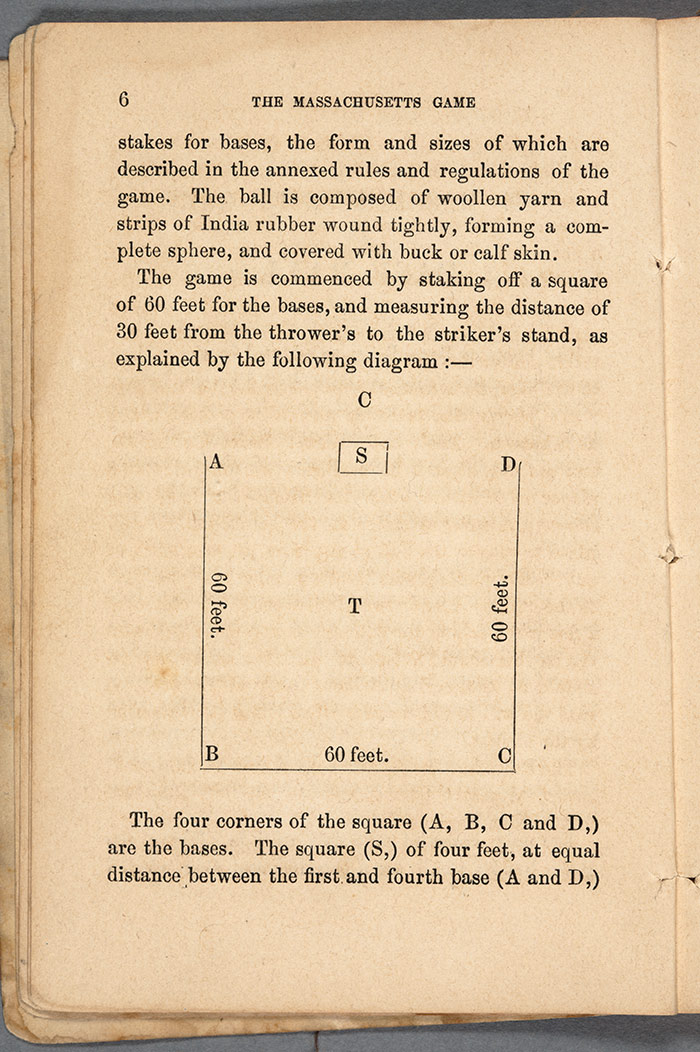 The Massachusetts Game, as adopted by the Massachusetts Association of Base Ball Players on May 13, 1858, was considered the favorite and principal game played throughout New England. By 1859, 20 clubs from across Massachusetts belonged to the association. According to the Pocket Companion, the only essential equipment they needed to play a game (besides a ball) was “a bat-stick, and four wooden stakes for bases. The game is commenced by staking off a square of 60 feet for the bases, and measuring the distance of 30 feet from the thrower’s to the striker’s stand.”