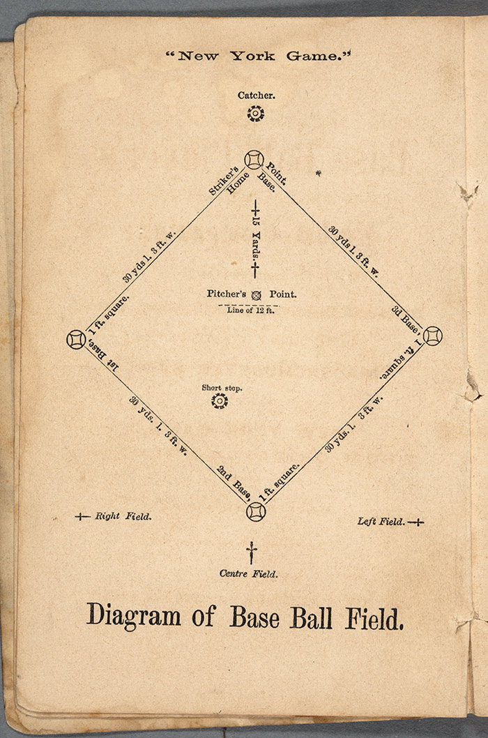 Diagram of the New York Game diamond from The Base Ball Player’s Pocket Companion, frontispiece, 1859, published by Mayhew & Baker, Boston, Mass. This layout called for larger dimensions than the Massachusetts-style square field. Bases were 30 yards apart, as they are today, and the pitching distance stretched to 45 feet. Not until the 1890s would this distance extend to 60 feet 6 inches, the current standard. The Huntington Library, Art Collections, and Botanical Gardens.