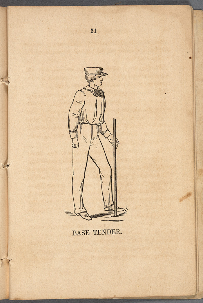 Base Tender. From The Base Ball Player’s Pocket Companion, 1859. Published by Mayhew & Baker, Boston, Mass. 5½” x 3¾”. One of four woodcut illustrations of Massachusetts Game players; the others are titled The Thrower, The Striker, and The Catcher. The Huntington Library, Art Collections, and Botanical Gardens.