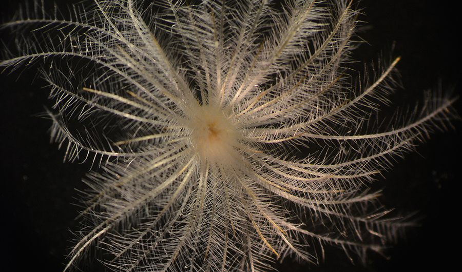 A magnified spine cluster of Mammillaria plumosa, showing the feather-like nature of the spines. Photograph by Raquel Folgado Casado.