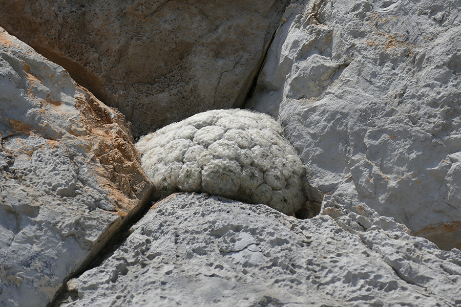 Mammillaria plumosa, nestled where two cracks in a cliff converge in Huasteca Canyon. Photograph by John N. Trager.