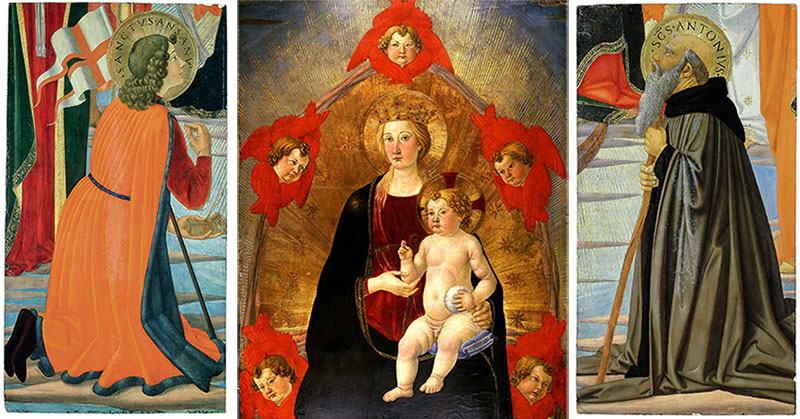Two newly acquired works by Cosimo Rosselli —Saint Ansanus (left) and Saint Anthony Abbot (right), both painted ca. 1470—rejoin Rosselli's Madonna and Child in Glory (center) in The Huntington's collections. Saint Ansanus (36 1/4 x 19 1/4 in.), Saint Anthony Abbot (36 1/4 x 19 3/8 in.), Madonna and Child in Glory (36 x 28 in.), tempera with gold leaf on poplar wood panel. The Huntington Library, Art Collections, and Botanical Gardens.