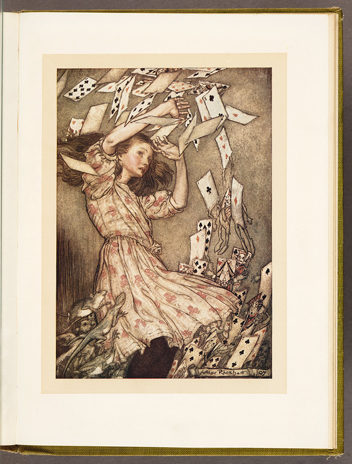 Alice attacked by a pack of cards in Lewis Carroll’s Alice’s Adventures in Wonderland, illustrated by Arthur Rackham, 1907. The Huntington Library, Art Collections, and Botanical Gardens.