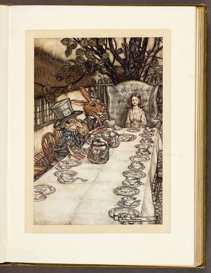 The Mad Tea Party scene in Lewis Carroll’s Alice’s Adventures in Wonderland, illustrated by Arthur Rackham, 1907. The Huntington Library, Art Collections, and Botanical Gardens.