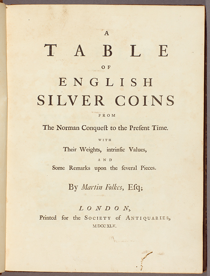 Title page of Martin Folkes’s A Table of English Silver Coins from the Norman Conquest to the Present Time, printed for the Society of Antiquaries, 1745. The Huntington Library, Art Collections, and Botanical Gardens.
