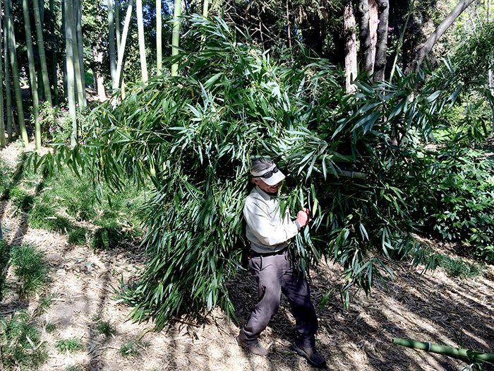 Carry-out order: Daniel Ramos, a senior horticulturist with the San Diego Zoo, carries a bundle of freshly cut timber bamboo (Phyllostachys vivax 'Wubujizhu', a Chinese native) out of a grove in the Japanese Garden. Photo by Lisa Blackburn.