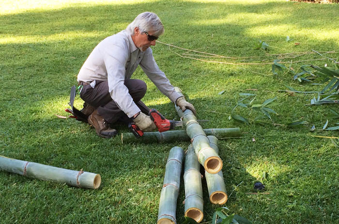 Senior horticulturist John Updike of the San Diego Zoo cuts thick culms of Bambusa beecheyana into smaller sections. Pandas peel these tough, fibrous stems into strips and eat them along with the tender leaves and branches. Photo by Lisa Blackburn.