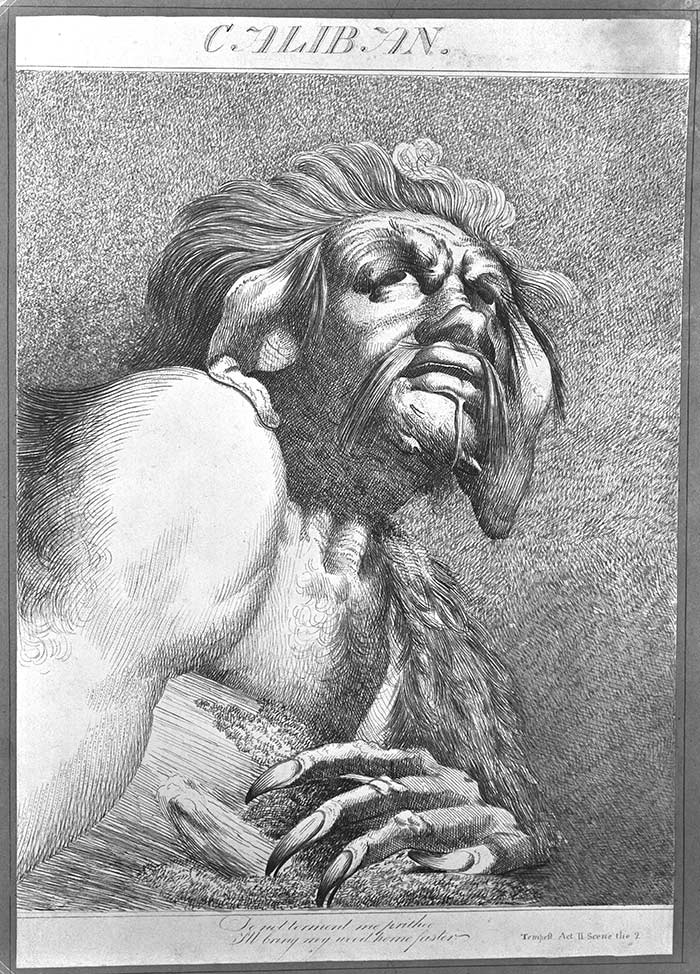 After John Hamilton Mortimer (British, 1740–1779), Caliban, undated, pen and black ink on paper mounted on board, rendered here in black and white. The Huntington Library, Art Collections, and Botanical Gardens.