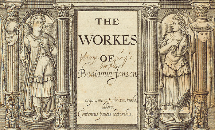 Detail of the title page of The Works of Benjamin Jonson, 1616, showing the inscription of Sir Henry Cary. The Huntington Library, Art Collections, and Botanical Gardens.