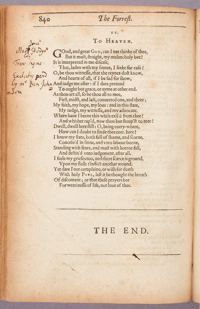 Other notable owners of Jonson’s Works in The Huntington’s collection include the essayist and poet Joseph Addison (1672–1719) and the great Victorian poet Robert Browning (1818–89). Most of the copies show evidence of having had multiple owners and readers. Some copies even record such circulation: one, for example, bears the inscription “S. Ruthin my Book Left me by a freind.” There are early female owners and readers, too, some of whom were not afraid to express their opinions. One Mary Jones Hodge, for example, singled out the poem “To Heaven” for praise as a “trew hyme” (see above).