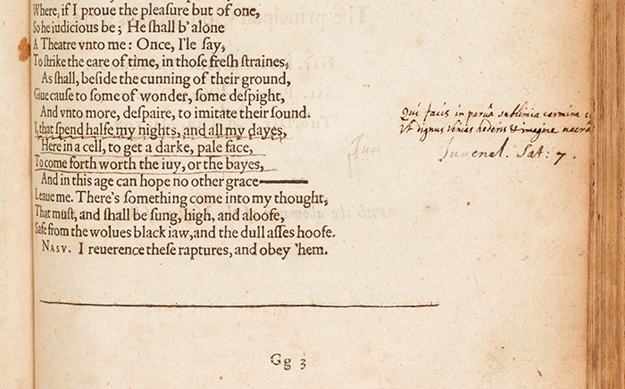 The Works of Benjamin Jonson, 1616, detail of page 353, with a marginal note giving a reference to Juvenal’s Satire 7 and a quotation from that poem: “qui facis in parva sublimia carmina [cella,] / Ut dignus venias hederis et imagine macra,” which may be translated as “you that are inditing lofty strains in a tiny garret, that you may come forth worthy of a scraggy bust wreathed with ivy.” The corresponding lines in Jonson’s text, which rework Juvenal’s words to suggest how hard Jonson himself has labored in order to be worthy of literary recognition, have been underlined. The Huntington Library, Art Collections, and Botanical Gardens.