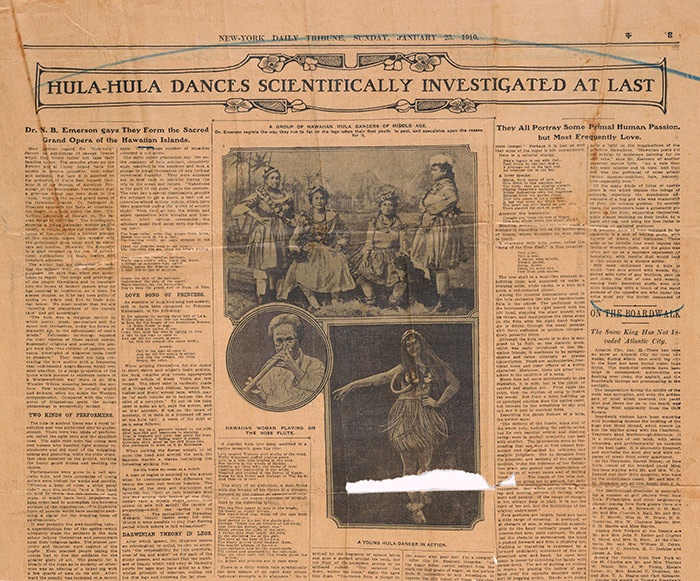Detail of an article about Emerson’s book Unwritten Literature of Hawaii in the New York Daily Tribune, Sunday, Jan. 23, 1910. The Huntington Library, Art Collections, and Botanical Gardens.