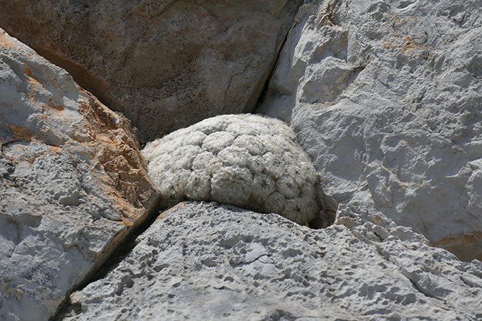 Mammillaria plumosa, nestled where two cracks in a cliff converge in Huasteca Canyon. The canyon is located near Monterrey, Nuevo Leon, Mexico. Photo by John Trager.