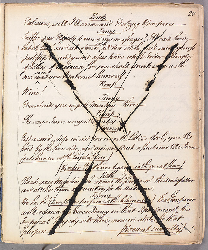 Political censorship can be traced right through the years 1737 to 1843, particularly at moments of national crisis: the French Revolution provoked a fraught debate on political reform in Britain which increased nervousness about what might be staged in front of “the people.” John O’Keeffe’s Jenny’s Whim; or, The Roasted Emperor (1794) gives us some idea of contemporary sensitivities. Although the play takes aim at the Emperor of Morocco, the rather frenetic marks on the manuscript make it clear that a satirical attack on any dramatic representation of monarchy was not to be tolerated in the wake of the execution of France’s King Louis XVI.