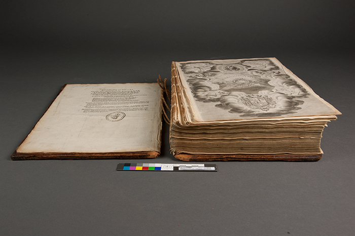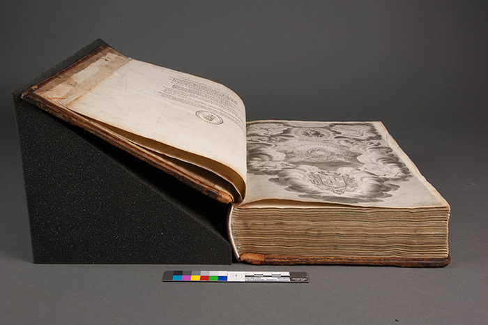 Hale’s copy of Rosa Ursina was originally bound in brown calf over wooden boards, with ornate blind stamping on the boards’ faces. When the book first came to the conservation lab, it was completely disbound, making it impossible to handle safely. Many Huntington scholars had requested Rosa Ursina over the years, but they were unable to access it in its disbound condition.
