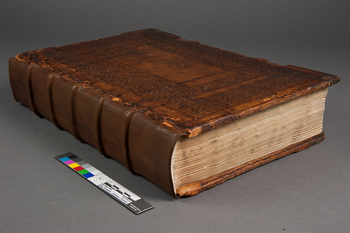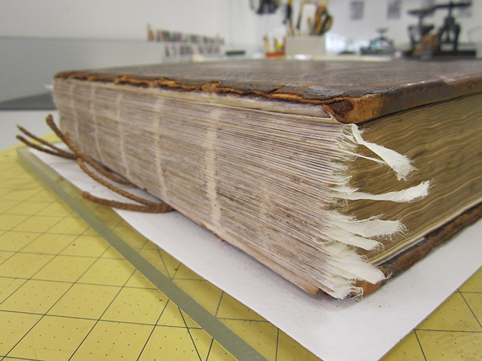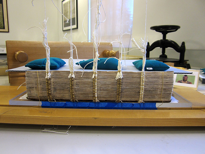 The resewn text block incorporates both the original sewing supports and the newly cabled cord. The Huntington Library, Art Collections, and Botanical Gardens.