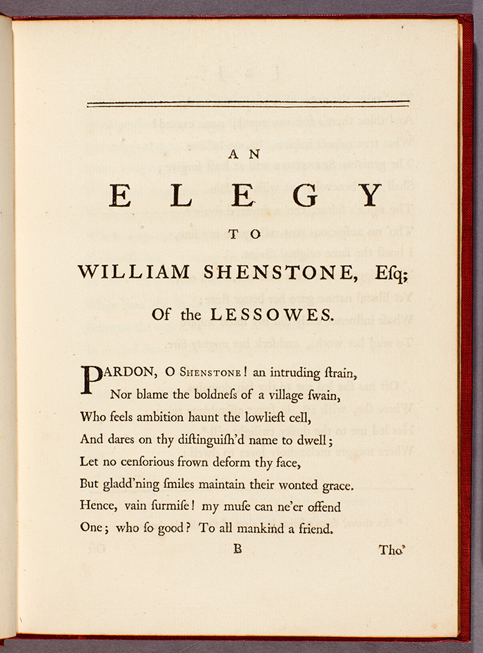 The beginning of Woodhouse’s first elegy to Shenstone in the 1764 Poems. The Huntington Library, Art Collections, and Botanical Gardens.