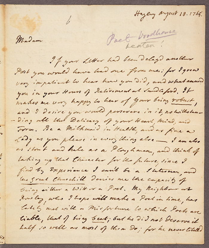 The Huntington’s collection of Elizabeth Montagu’s correspondence—totaling some 7,000 items—includes 14 letters sent to her by Woodhouse. I was also interested in letters between Montagu and her friends, as these mentioned him often. One letter from Lyttelton to Montagu struck me, not least because it had the words “Poet Woodhouse beaten!” scrawled across the top.