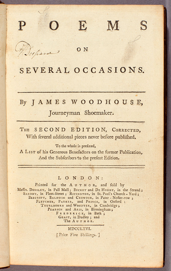 In his 1766 expanded second edition of poems, Woodhouse makes explicit his occupation as a “Journeyman Shoemaker” (not a cobbler) and also writes his own preface. The Huntington Library, Art Collections, and Botanical Gardens.