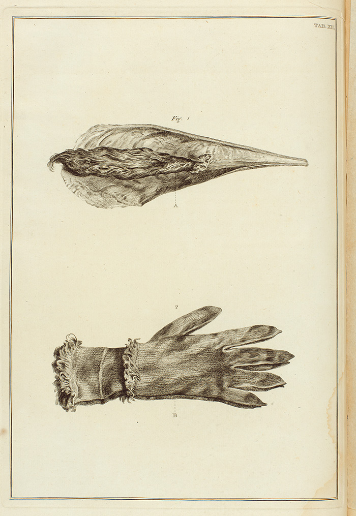 Illustration of a Pinna marina shell, with its “beard,” above a pair of men’s gloves made in Andalusia out of a Pinna marina beard. Jan and Andreas van Rymsdyk, Museum Britannicum, London, 1778, plate XII. The Huntington Library, Art Collections, and Botanical Gardens.