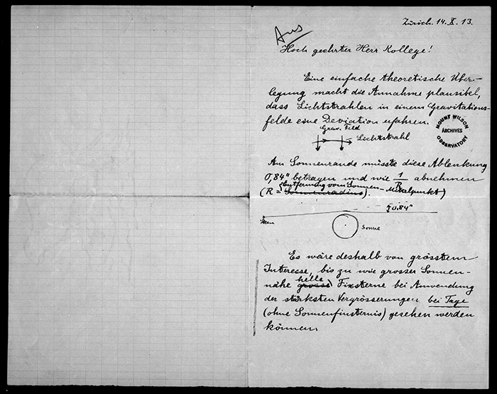Over the ensuing months and years, Einstein corresponded with several astronomers to draw attention to the importance of his theory and solicit their help in refining his predictions through astronomical observation. One person he wrote to was Hale, founder of the Mount Wilson Observatory, which was home at the time to the world’s largest operational telescope. As a solar physicist, Hale would become best known for his discovery of magnetic fields in sunspots, but he also possessed remarkable terrestrial influence, helping to found both The Huntington and the California Institute of Technology. Einstein’s letter is one of the gems among Hale’s papers at The Huntington.