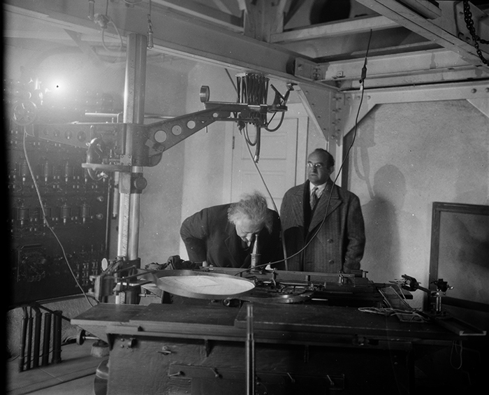 Einstein peers into the solar telescope’s eyepiece, with Mayer in the background. Mount Wilson Observatory. Jan. 29, 1931. The Observatories of the Carnegie Institution for Science Collection at The Huntington Library, Art Collections, and Botanical Gardens.