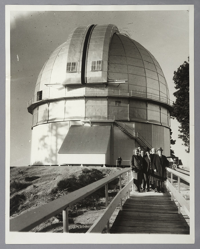 Left to right: Albert Einstein, Edwin Hubble, Walther Mayer, Walter S. Adams, Arthur S. King, and William W. Campbell pose in front of the 100-inch telescope dome at Mount Wilson Observatory. Jan. 29, 1931. The Huntington Library, Art Collections, and Botanical Gardens.
