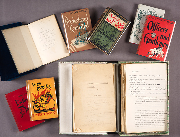 Books from the Evelyn Waugh Papers, with Waugh’s autograph manuscript of his travelogue Ninety-Two Days at bottom right. The Huntington Library, Art Collections, and Botanical Gardens.