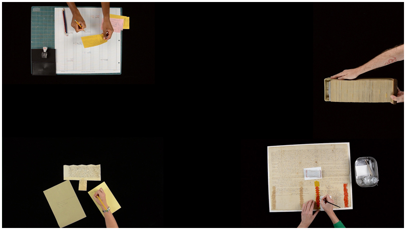 Projected onto a table designed for the installation, the video shows dozens of pairs of hands of people working with and using The Huntington’s rare library materials. There are hands repairing wax seals, hands searching for items in a card catalog, hands marking items in an auction catalog, hands reviewing microfilm, hands mixing paste, hands examining color slides on a light box, hands comparing a manuscript to a book.