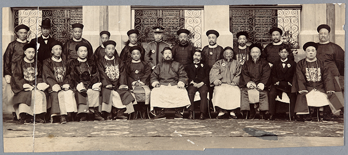 Hong Yen Chang, second row, far left, dressed in Western-style clothing and a bowler hat, at the time when he served as the accountant general to the Shanghai Bank treasury. The Huntington Library, Art Collections, and Botanical Gardens.