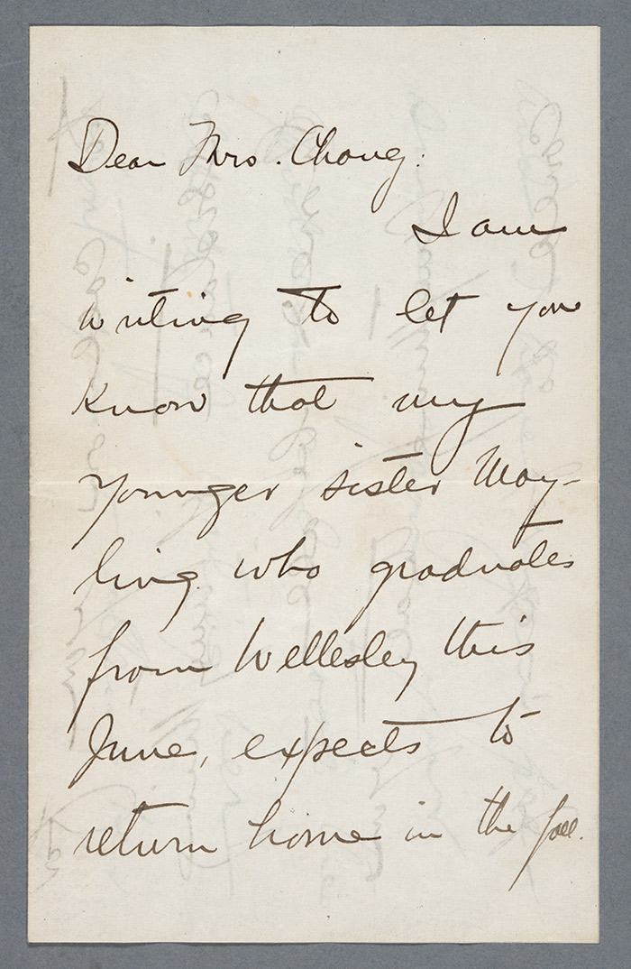 Letter from Soong Ching-ling to Charlotte Ah Tye Chang (Hong Yen Chang’s wife), March 14, 1917. Soong Ching-ling, who was educated in the United States, was the second wife of Sun Yat-sen, a leader of the 1911 revolution that established the Republic of China; she later went on to become vice president of China, under Mao Zedong, from 1949 to 1954. The Huntington Library, Art Collections, and Botanical Gardens.