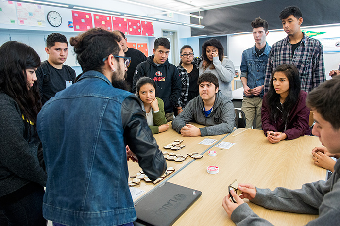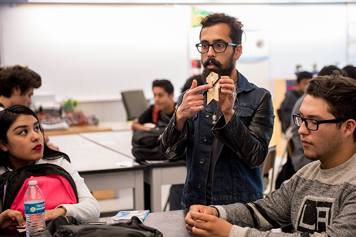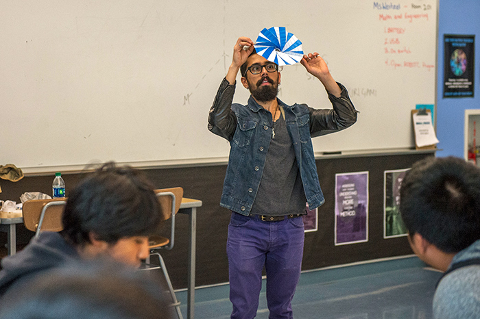 Manan Arya, a Caltech graduate student, designs and tests methods for packaging and deploying large, thin structures for spacecraft. Arya taught engineering students at Esteban E. Torres High School some of the origami folding techniques that inspire his work. Photo by Martha Benedict.