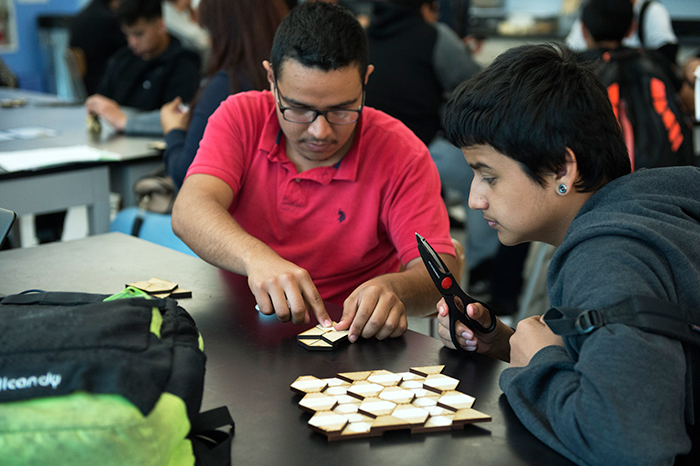 The teens reached into a cardboard box and took out four wooden pieces. Each tile was made from two pieces that had been cut by laser into a trapezoid shape and glued on top of one another. Arya demonstrated how to position the tiles and where to use cloth tape to attach some of the sides as a sort of membrane hinge. He went around the room, checking on their progress.