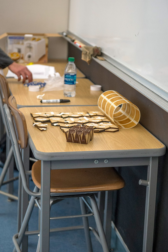 Students attached wooden tiles with cloth tape to create a Miura-Ori model, an example of which is seen in the foreground. Photo by Martha Benedict.