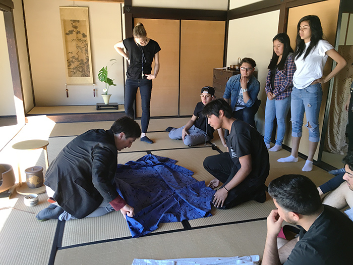Torres students including Kenneth Morales (right) work with Robert Hori (left), The Huntington’s gardens cultural curator and program director, to fold a kimono inside the Japanese House. Torres engineering teacher Lindsay Weitzel, in black, looks on. Photo by Marissa Kucheck.