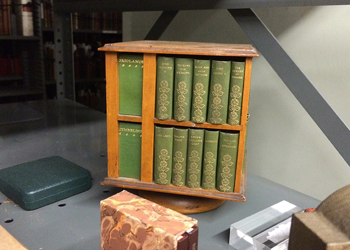 Miniature Shakespeare books in a six-inch-high, rotatable bookcase.