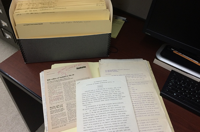 The Pro Bowl material is just so anachronistic to most people’s image of The Huntington. It includes early correspondence between NFL commissioner Pete Rozelle and the Pro Bowl’s co-director Glenn Davis, as well as an early TV contract for the game and player contracts stipulating exactly how much each man received for food each day. This box contains the first twinklings of the NFL as we know it and includes requests by star players for special helmets and cleats and enormous (for the time) television revenue. As a lifelong football fan, I considered the day I found this box a red-letter day, and I may have spent a little too much time reading the folders while I cataloged.