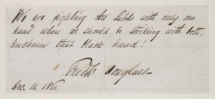Note written and signed by Frederick Douglass, dated Dec. 11, 1861. It reads: “We are fighting the Rebels with only one hand when we should be striking with both. Unchain that black hand!” The Huntington Library, Art Collections, and Botanical Gardens.