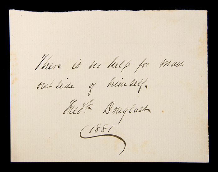 On Dec. 17, 1881, Frederick Douglass wrote a letter to Caroline M. Seymour Severance (1820–1914), a prominent abolitionist and suffragist. The letter included a “small contribution in aid of your effort in behalf of the Woman’s Hospital Fair.” The small contribution was an autograph of a paraphrase from his famous autobiography, just published in its latest edition. The card reads: “There is no help for man outside of himself.”